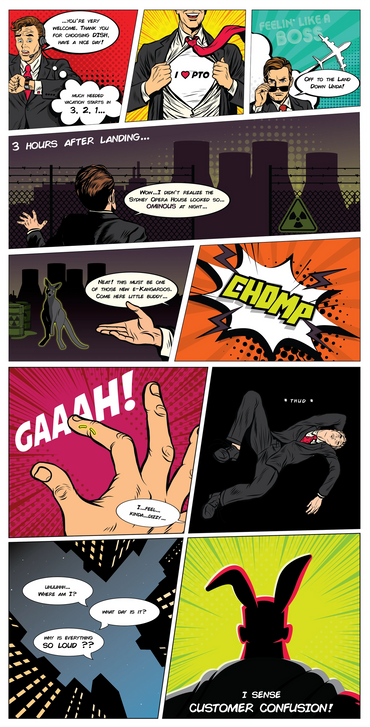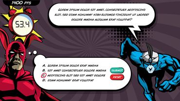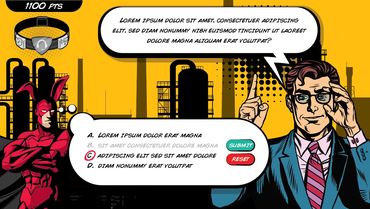 Parodying an amalgamation of various superheroes, the task was to build a game-like framework for e-learning quizzes to boost engagement. We conceived of a mascot-themed superhero, Hopman, who battles his arch nemesis Quizzler, a genie-themed villain based on a competitor's branding.